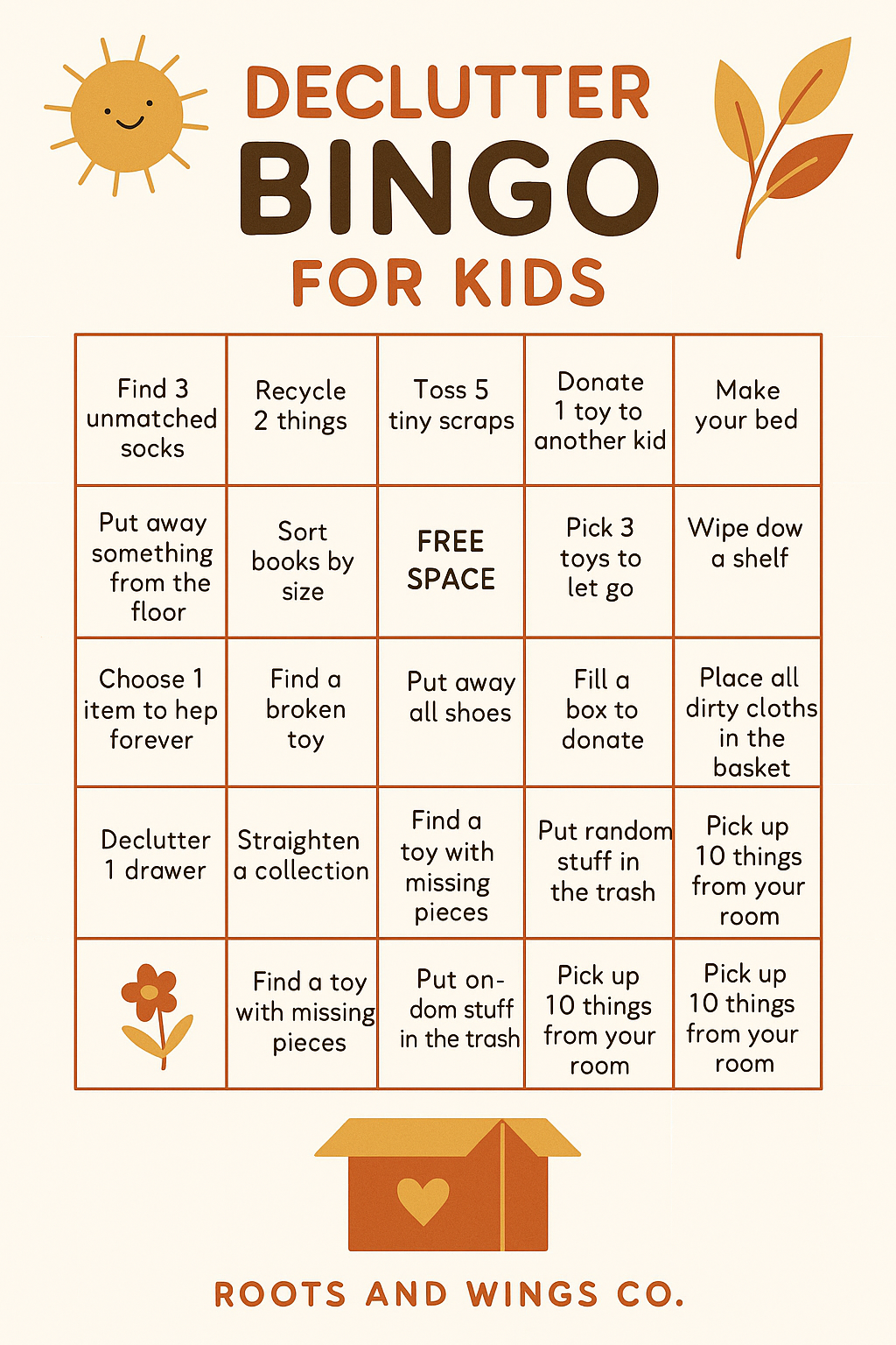 Take a picture of their donation pile. Let them share with a grandparent what they cleaned. Add “Completed Declutter Bingo” to your fridge like it’s an Olympic medal.